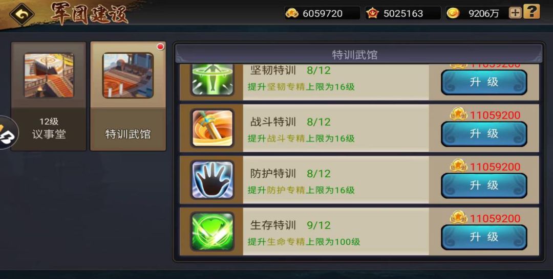特训武馆升级能够提升军团特技中的攻击专精、防御专精、生命专精、命中专精、闪避专精等特训技能的等级上限发生改变,其中军团成员会优先升级特训武馆里战斗专精、防护专精、坚韧专精,从而获得攻击、防御、生命值的百分比加成,因为随着角色的养成,百分比加成作用会愈发明显。
