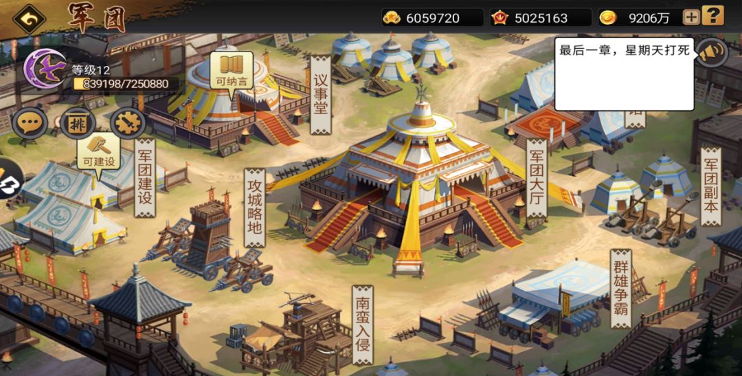 这里建议优先升级议事堂,这样军团收集粮饷的速度会增快,团员们获得的军功也会增高,进一步加快军团成长的步伐,可谓环环相扣、相得益彰。