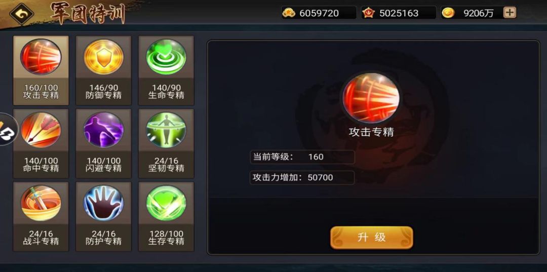 军团成员可以在军团特训中通过消耗军功来提升特训技能的升级。基本特训属性包括攻击、防御、生命、闪避、命中,都是玩家养成中不可或缺的属性。其中尤以三大基础属性百分比加成最受玩家青睐。战斗专精、防护专精和坚韧专精,每次升级都能增加1%的对应属性,对战力加成尤为明显,是每位玩家优先考虑升级的特训技能。