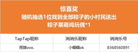 【找粽有惊喜,“粽”享定制礼!】活动现已开奖!恭喜获奖的各位小村民!本次活动道具奖励将在7个工作日内通过游戏进行发放,周边奖励将在30个工作日内发放,感谢您的支持与理解,之后也请多多支持消消乐(づ ̄3 ̄)づ╭❤