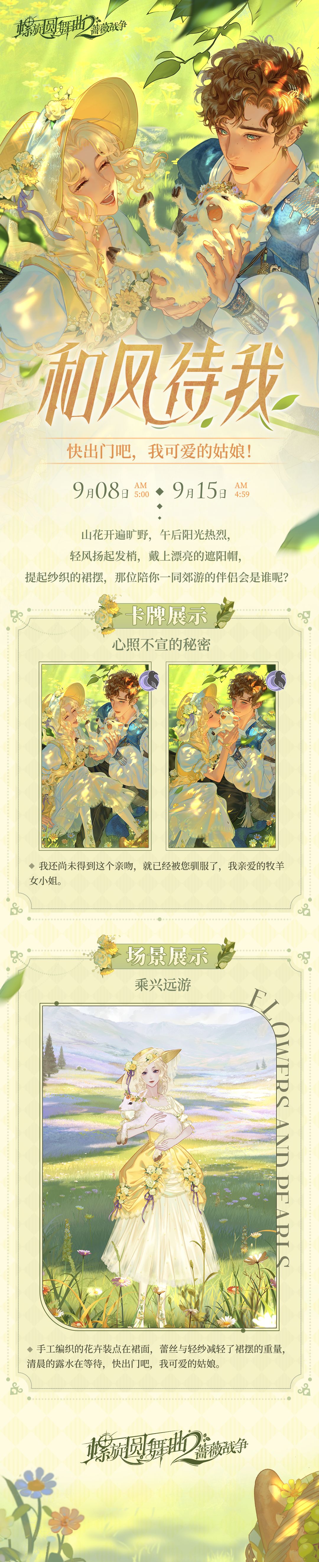 9月8日5:00-9月15日4:59,点击主界面「抽奖」进入「午后牧场」奖池,使用「野餐篮」抽取活动限定套装【和风待我】、限定卡牌【心照不宣的秘密】。