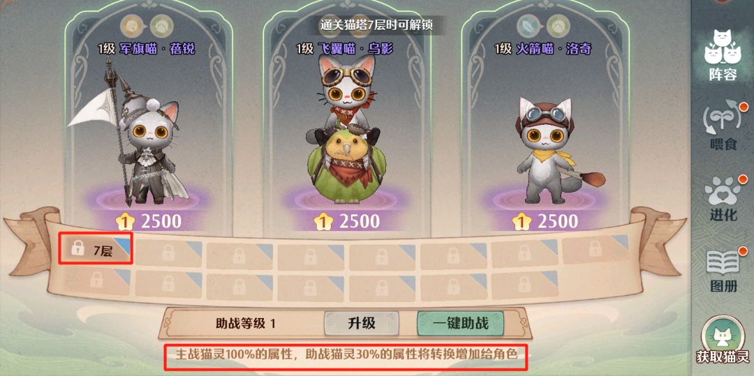 4)多打阿奇古塔开助战位,升级主战位可以上阵更多、更高品阶的猫灵,提升角色属性(助战猫灵30%的属性将转换增加给角色)。