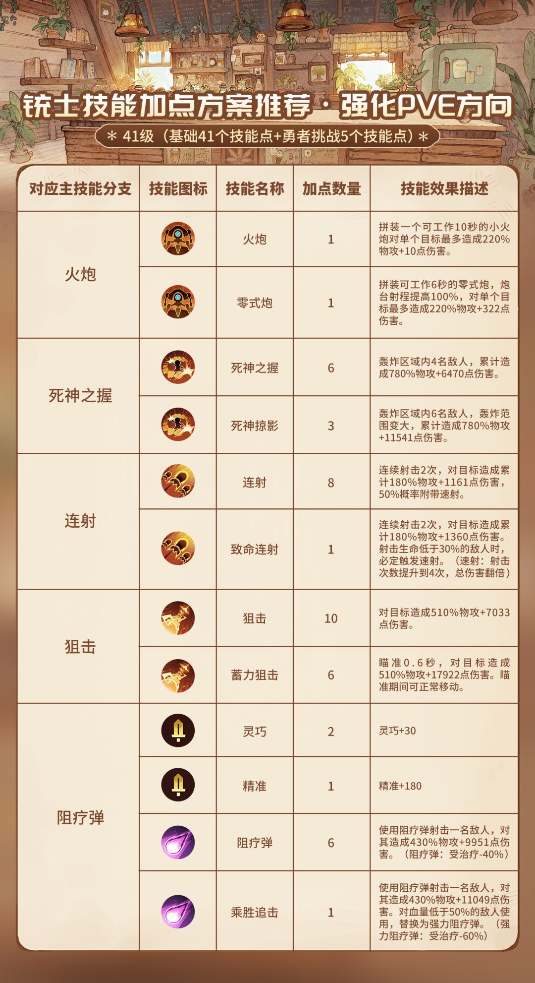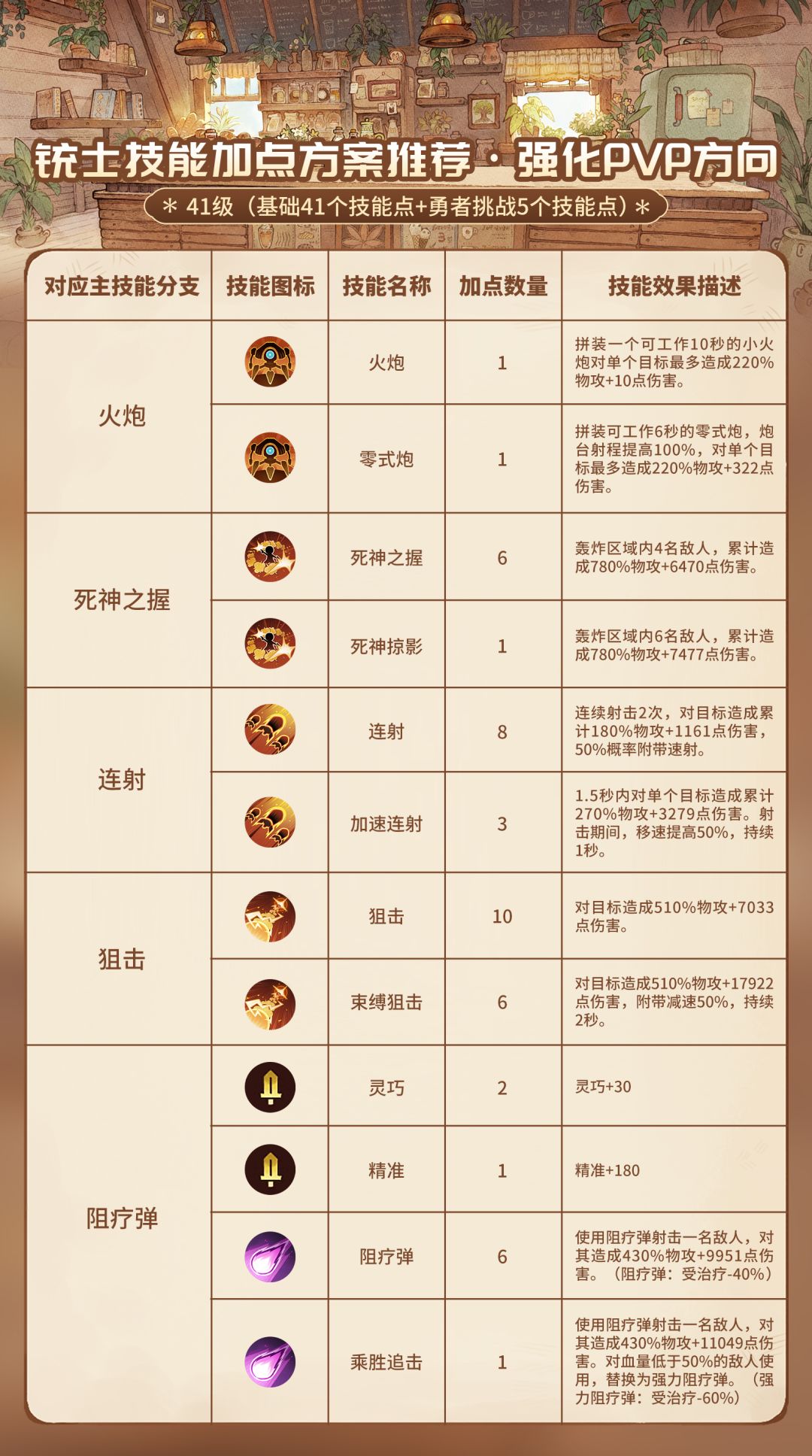 铳士有5个主要技能,基于技能特点可以分为2种基础的技能方向,强化PVE输出方向和强化PVP输出方向,为了让勇者们更轻松上手,特准备了两套参考的技能加点方案,供勇者们参考。
