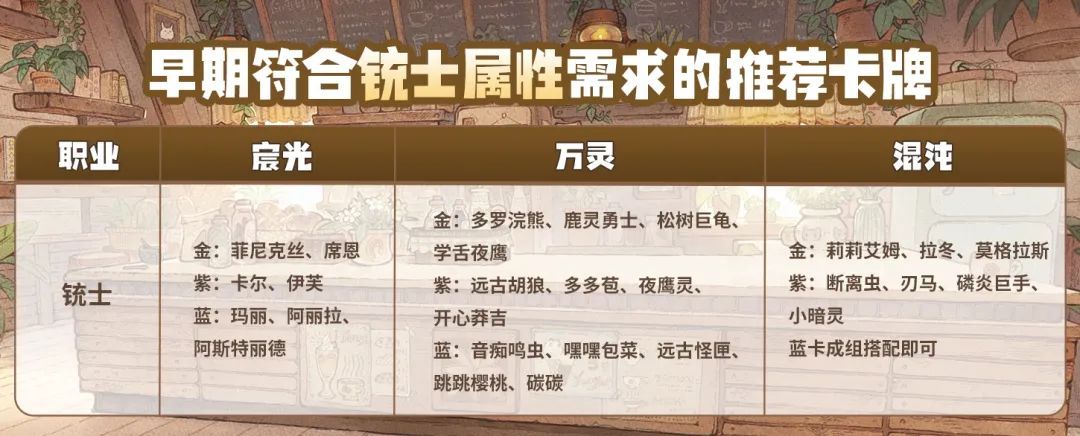 早期有什么卡牌上什么卡牌,优先考虑:卡牌极限战力(受卡牌品阶、卡牌星级影响)>卡牌成套(极限相近的情况下,尽量凑2/3/4张的套卡效果)>实战属性需求(铳士优先选择物理攻击、精准属性加成),活动赠送和碎片合成的卡牌也记得优先选择加攻击、精准、暴击,能提升铳士杀伤力的卡牌(如学舌夜鹰、鹿灵勇士等)。