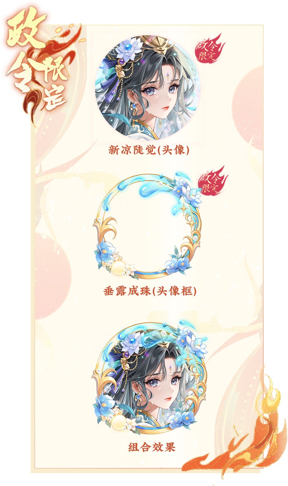 新的一期上凰政令将于9月11日00:00至10月9日23:59开启,提升政令等级,购买进阶方案,有机会获得全新头像“新凉陡觉”,头像框/气泡框“垂露成珠”