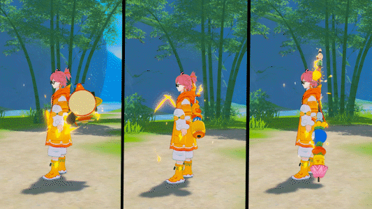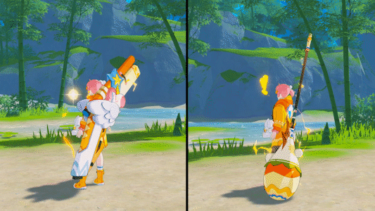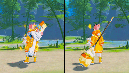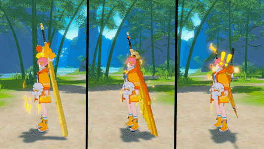 与金秋相同色调的时装,兔子玩偶悬挂在腰间,随身会散发着金色的闪电光芒特效,彰显着电玩的特色,希望能让各位冒险者喜欢!