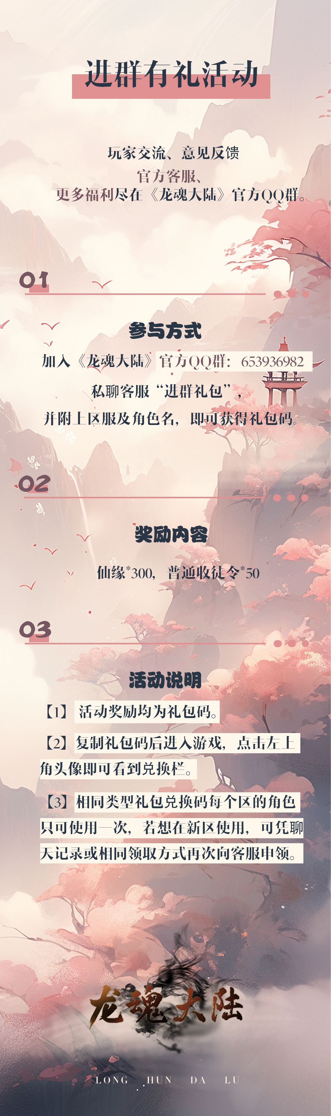 参与方式:加入《龙魂大陆》官方QQ群:653936982,私聊客服“进群礼包”,并附上区服及角色名,即可获得礼包码。