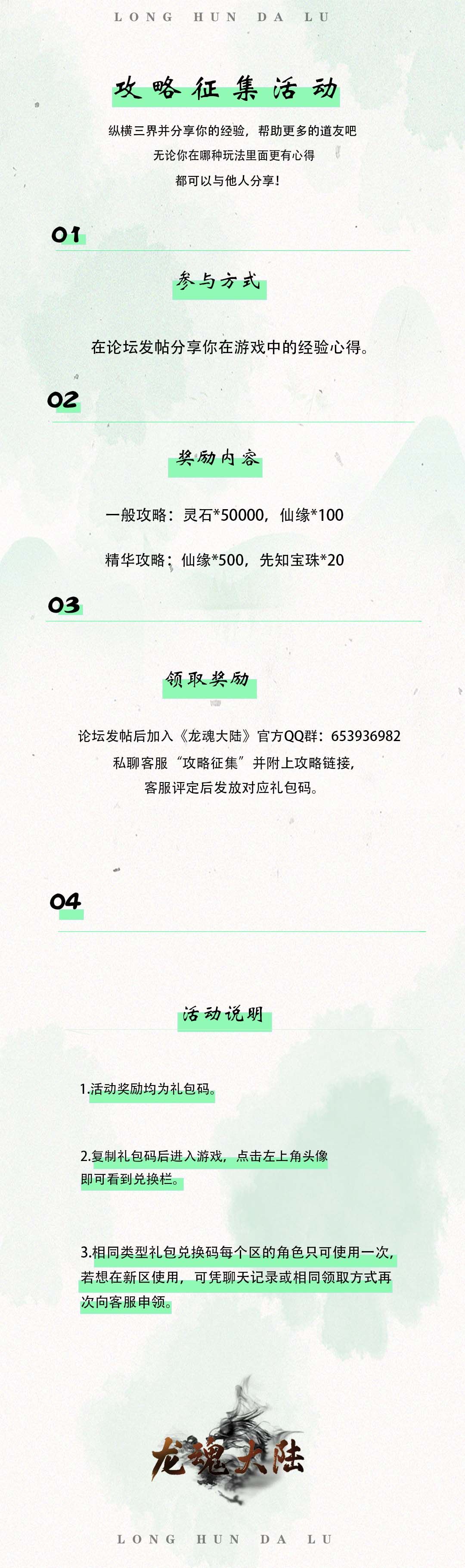 领取奖励:论坛攻略区发布攻略后加入《龙魂大陆》官方QQ群:653936982,私聊客服“攻略征集”并附上攻略链接,客服评定后发放对应礼包码。