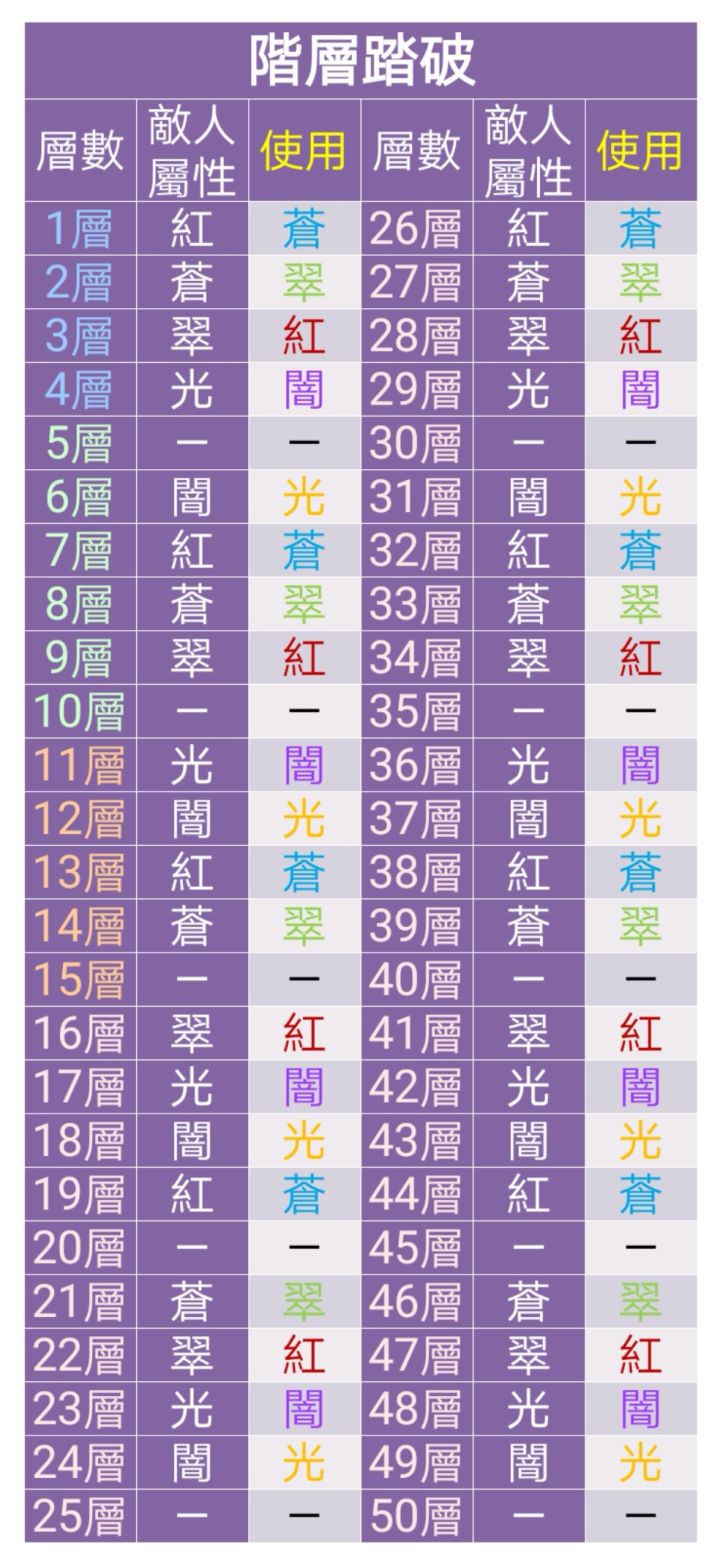 “—”是敵人為無屬性的關卡,用什麼屬性的都行。
