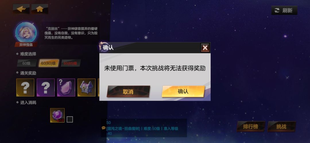 5、再补充一个小技巧,很多人不知道异神傀儡其实是有练习模式的,取消门票勾选就可以练习了,建议先练习几次,十拿九稳再去实战