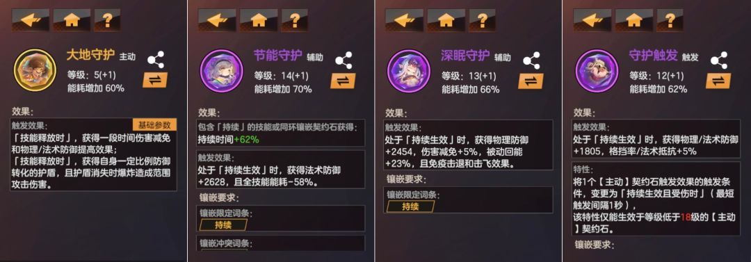 4、契约石推荐:瞬发位移类的技能推荐带【大地守护】,提供10%的伤害减免,加物理和法术防御,还能给你套一个护盾;持续技能推荐带上【守护触发】、【节能守护】、【深眠守护】,回蓝+提供双防