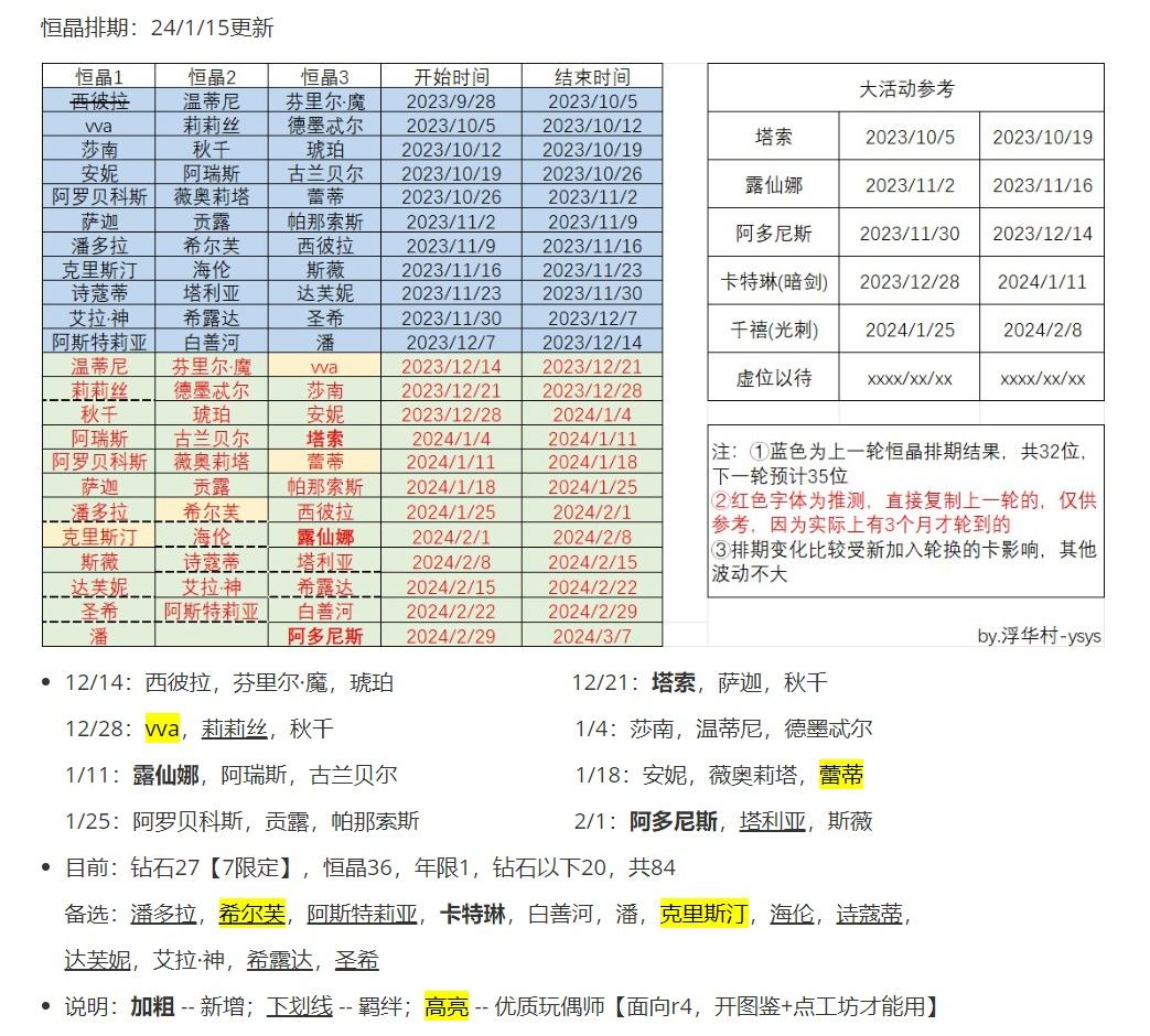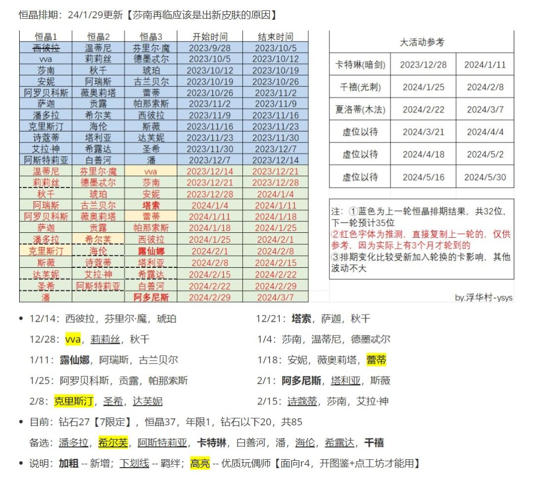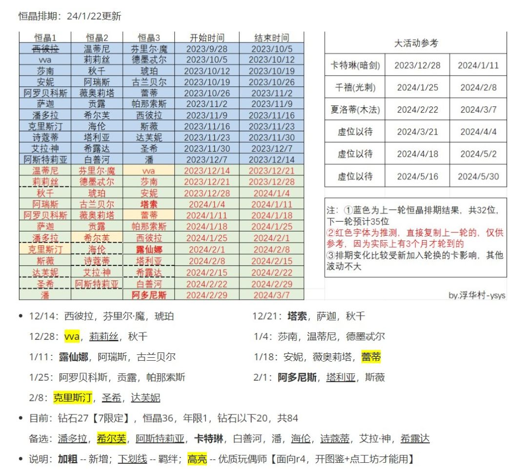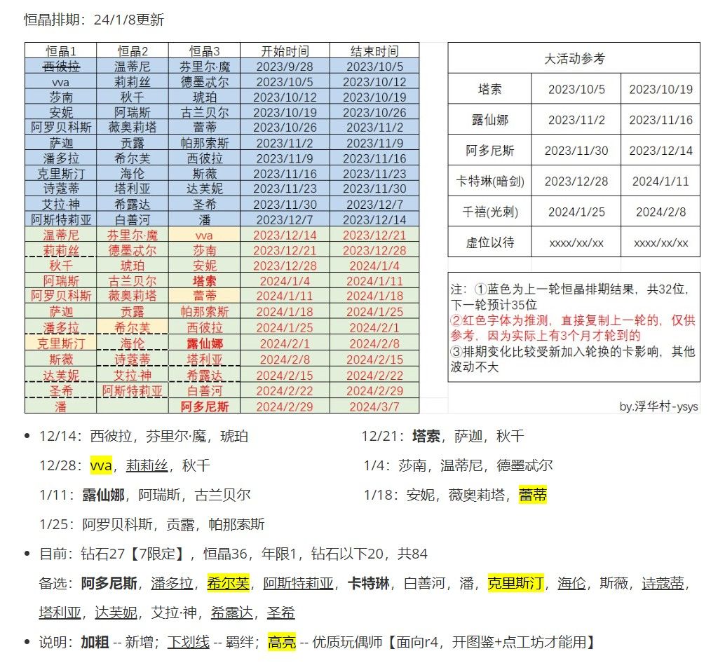 11/27:表格上次更新有点问题,上一轮的32个,少了一行,补上了。还有就是“优质玩偶师”描述新增面向r4,因为r5基本都全图鉴了,没必要再额外强调这个。最后就是西彼拉本轮异常提前(也有可能是多排了一次)。