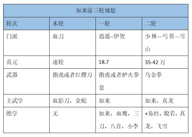 这个五个门派要分配到未轮、一轮和二轮,此外,还要考虑中间去一次逍遥学福地武学,还有三轮四出可以额外去的门派,其实前三轮是有比较大的调整空间,也可以适当选择不去一些门派,或者重复去一些门派,例如玩如来就可以在二轮去一次少林,毕竟即使重复去少林的真元跟去雪山不会有太大差距。