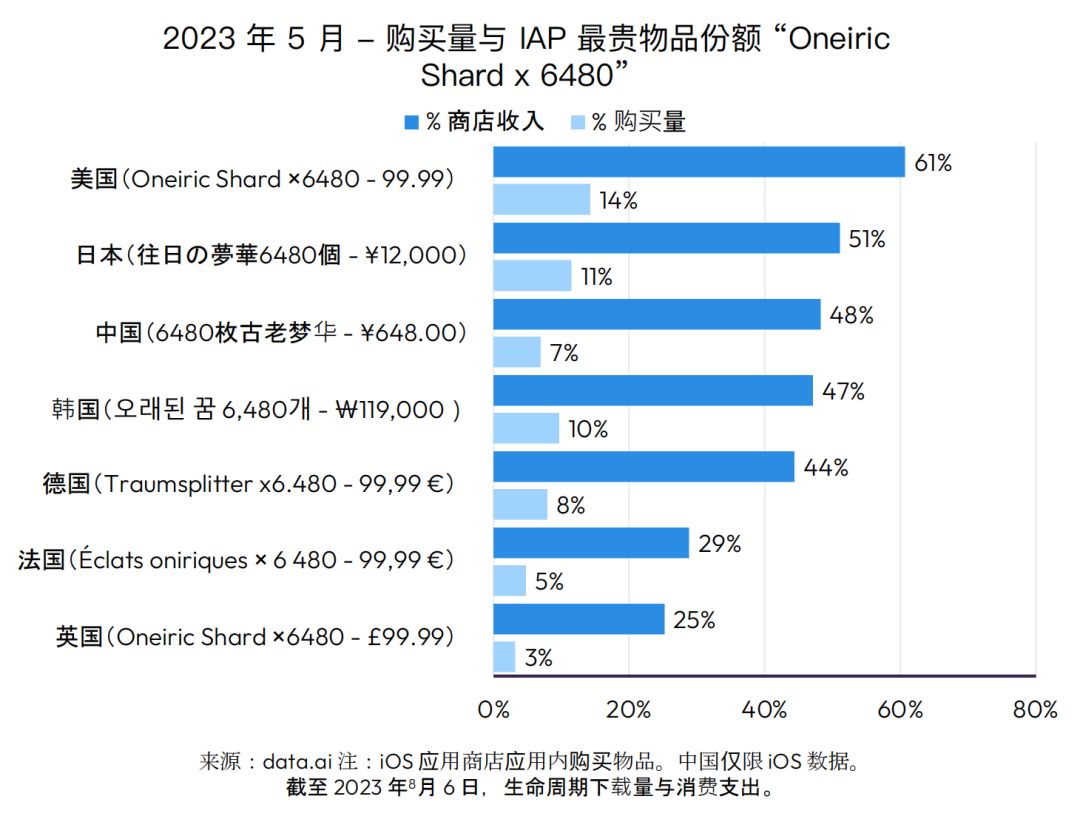 「6480古老梦华」为美、日、中市场崩铁内购收入贡献最多的项目,分别以14%、11%和7%的数量占比,贡献了其当地市场收入的61%、51%和48%。