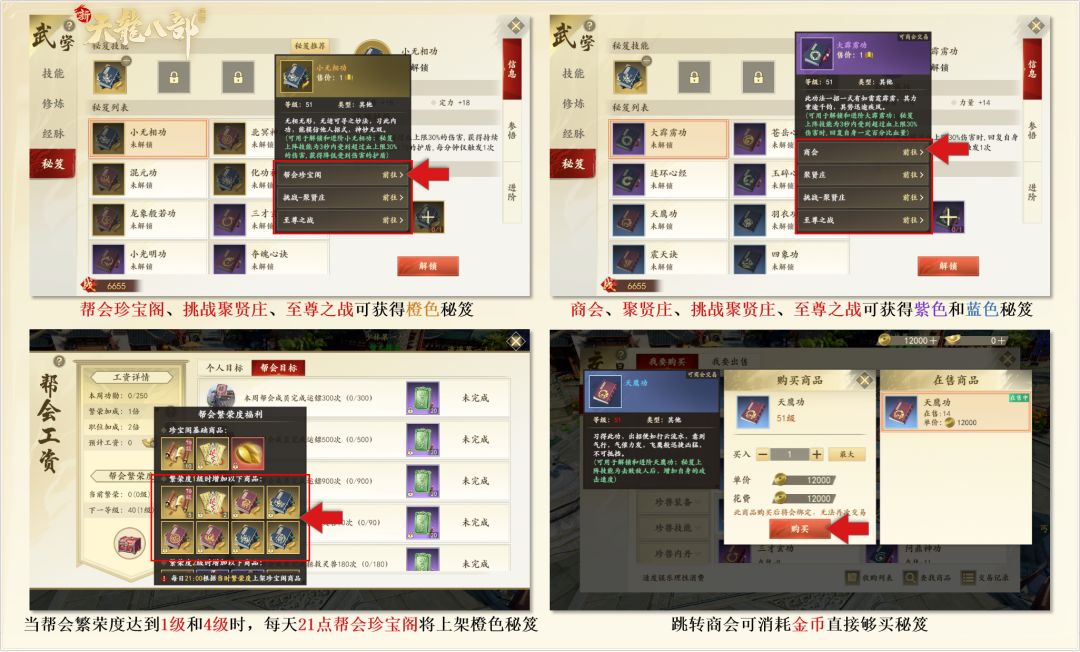 秘笈及养成材料获取:聚贤庄副本、至尊之战、帮会珍宝阁、商会购买