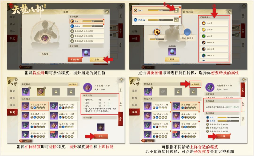 秘笈强化:秘笈可以通过洗尘珠的参悟来逐步强化。消耗相同秘笈即可进阶秘笈,提升秘笈属性和上阵技能。上阵秘笈选择:如不知道如何选择秘笈,可点击【武学-秘笈-秘笈推荐】查看各门派详细的大神推荐套路