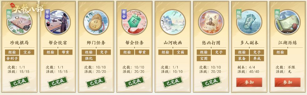 进入游戏后首要任务就是冲级,在开服初期,等级就意味着资源,优先做主线任务,做到主线任务卡住后,再进行支线。之后可以进行乾坤论武,多人副本,以及限时活动的珍珑棋局。先把江湖历练刷完再去做单人的师门任务、帮会任务、山河映画还有惩凶打图,因为这些经验随角色等级提升,最后面做才能保证经验最大化。