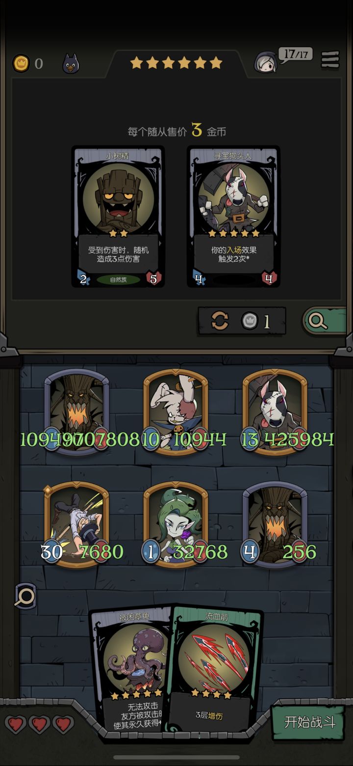 “镜中的记忆”关于“战斗前攻击和防御”属性的成就:建议难度2,选野兽和自然,前期自残苟活,后面找核心关键卡牌:5星寻宝狗头人、6星梦境之树、6星幼兔和5星猫头鹰法师。方法就是先上寻宝狗头人(最好金色,能触发3次),然后入场猫头鹰,再放下梦境之树,猫头鹰给的牌千万不要入场,必须直接卖掉(否则会污染“入场”池)然后再入场幼兔(保证幼兔触发猫头鹰的给手牌),然后卖卡触发大树的+1+1效果,这样反复刷属性。
