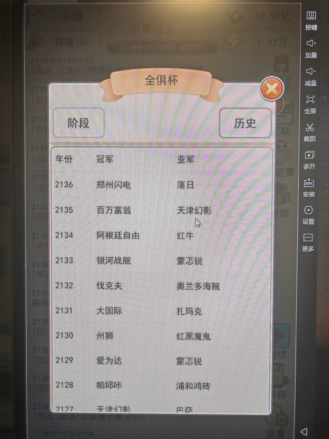另外。关注升降级,等自己建的的球队升入中超后给钱,我是按照论坛上划的金钱数给的,虽然会负债,但是实力提升的快,全俱杯我都不知道就拿了冠军,ps.拿冠军的时候俱乐部世界排名50+