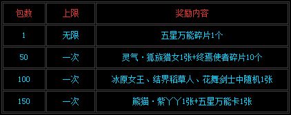活动二、限时礼包,倾情上架活动期间,限时包上架,售价100晶钻,抽取指定数量限时包再送卡: