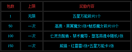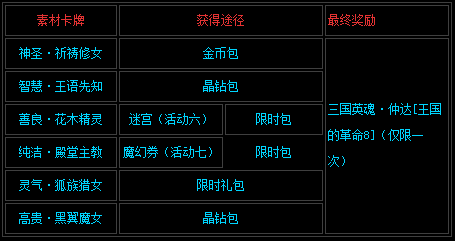 活动期间,收集指定素材卡牌组合可兑换各种稀有卡牌哦,每档奖励均只能获得一次,详情如下: