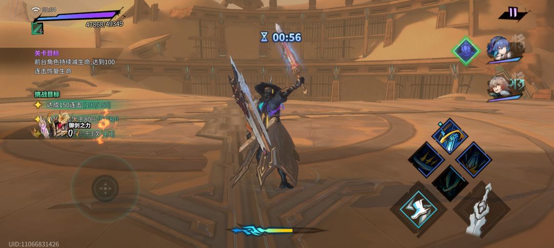 三人关,本关机制为持续掉血,只要保持连击就能恢复,总体来说难度依然很简单150连击随便打就能达成。唯一要注意的就是需要放三次奥义,起手就切吕仙宫一轮武灵技狗直接开奥义,切回铁卒输出一轮放完奥义后再切吕仙宫开武灵技和奥义,铁卒技能cd的时候切阎风吒输出,boss攻击欲望不高打起来颇为轻松。