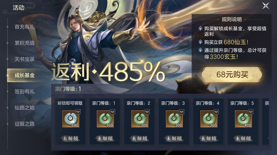购买成长基金立获大量仙玉,还可享受超值返利!且每次提升宗门等级均可获得玄玉,宗门等级提升至9级累积可获得超值返利!(仙玉可1:1兑换为玄玉)