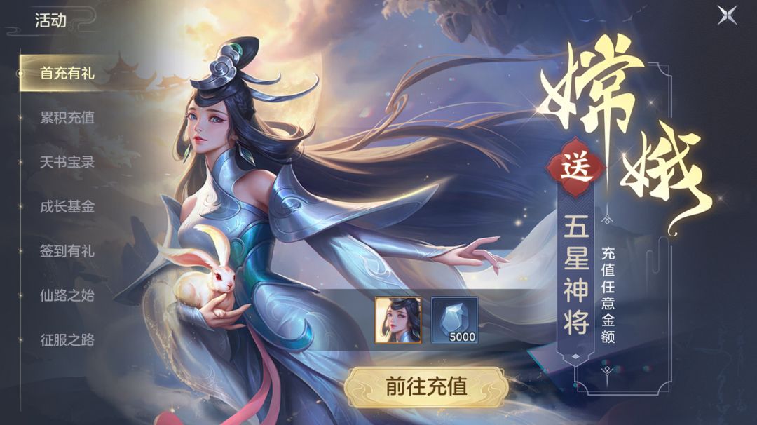 各位宗主仅需在游戏内充值任意金额、无需消耗,即送五星神将-嫦娥、灵石。