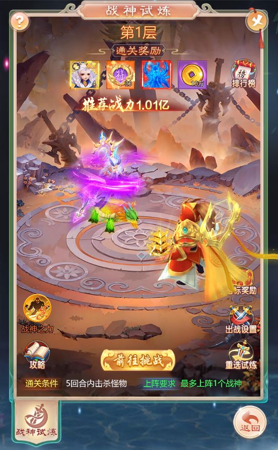1.每层挑战成功后会获得通关奖励,包含大量战神封神养成材料,更有XR、UR、FR战神皮肤碎片等你来拿