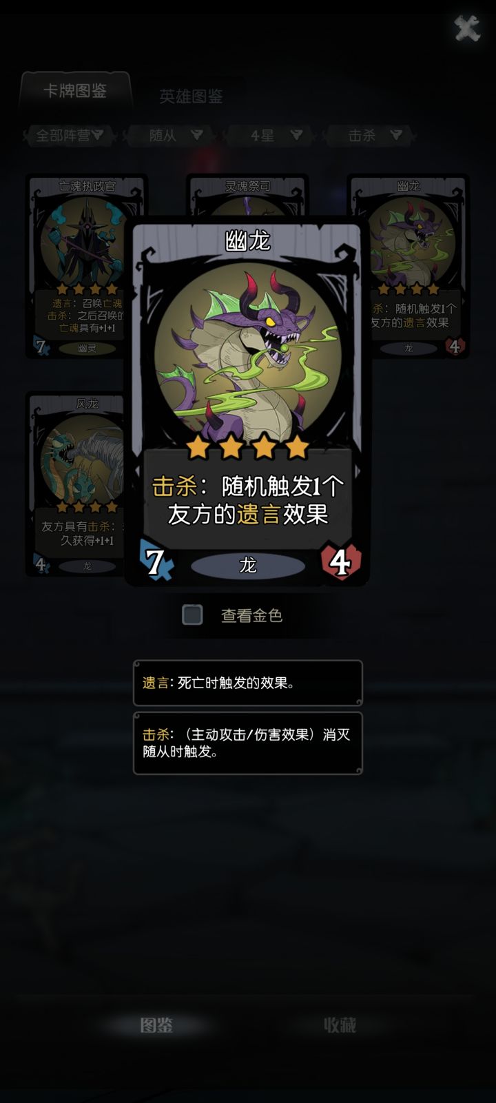 关于击杀效果:装备最先触发 然后是特效类(加金币之类的 加亡灵身材)然后是随从的伤害型击杀触发 最后是身材buff类 然后是幽龙的击杀触发遗言。