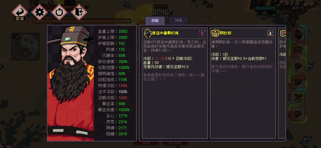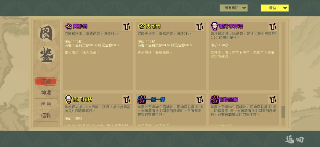 后期技能选择:接下来才是重点,二级后金蛋鸡和贷款优先选择金蛋鸡,召唤死亡给钱,因为选择了贷款优先,后期打到的银元只能先还贷款,卡经济了,一旦出了这两个技能必须保证这两个技能一直同在,否则一旦组合神通失效,那么恭喜你,你只能慢慢还贷,尤其是出了欠款甲,你有还不完的贷,还没经济升换技能。