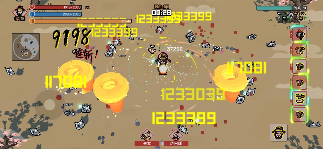 开局:开局只有一个火球术,如果天赋加资金已开,可以前期先选两个技能,前期过度最好是火球配套的光柱,先稳定输出,后面技能尽量选择站着赚钱,跑着赚钱个人觉得没必要,可以后期四个技能都选择站着赚钱,作为过度二级技能的铺垫。