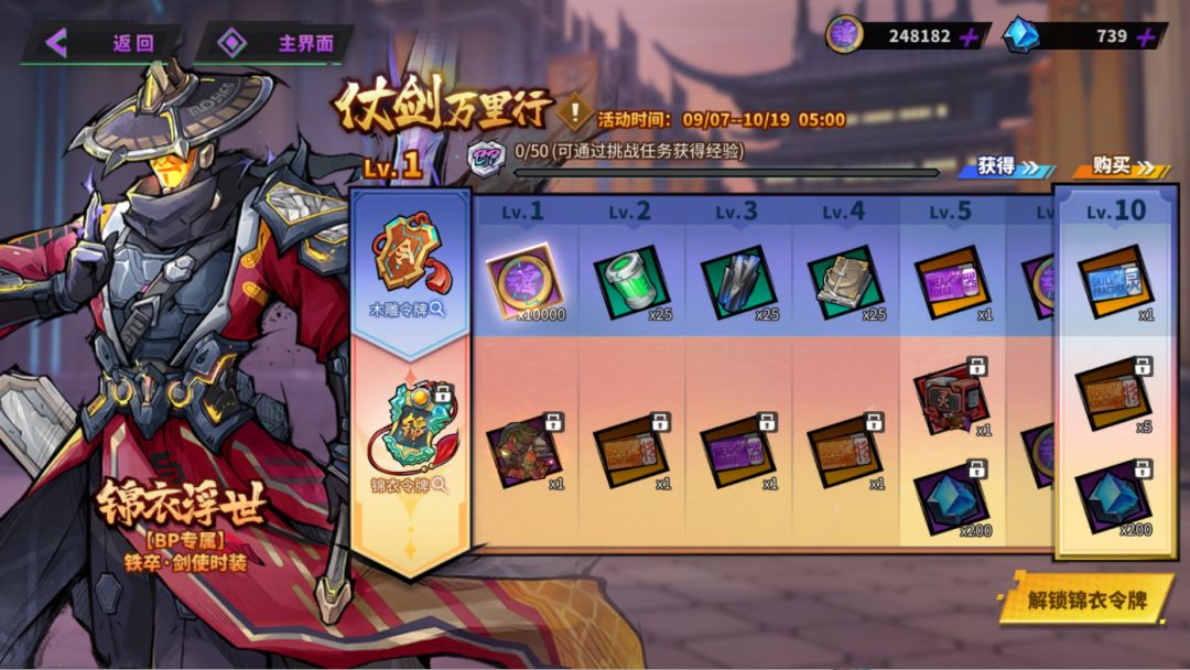 活动开启时,免费解锁【木雕令牌】。开启【锦衣令牌】后可解锁额外的奖励线并立即获得「铁卒·剑使」专属时装「锦衣浮世」!