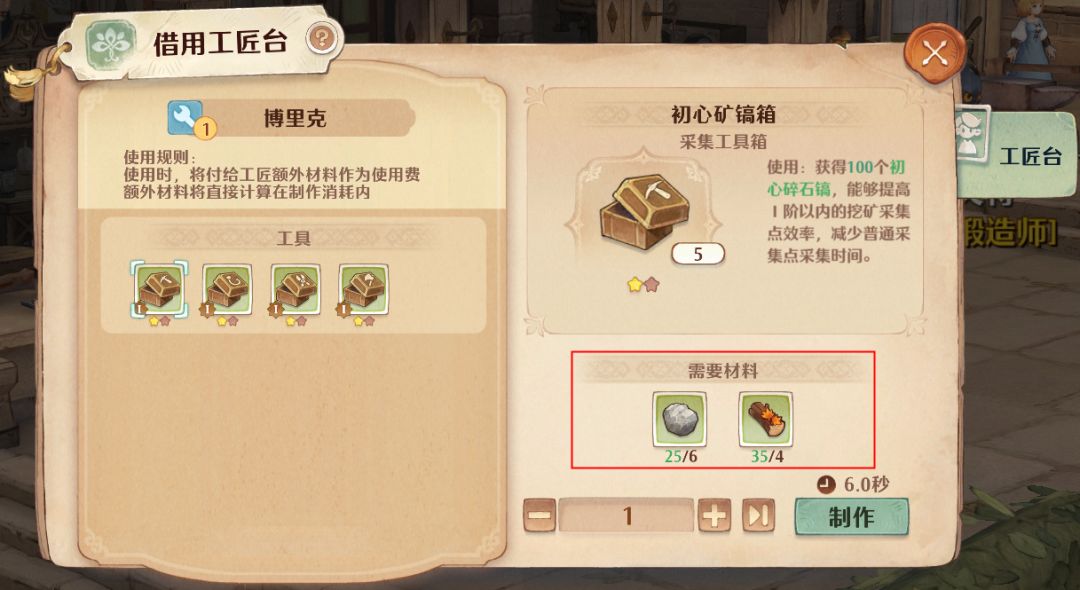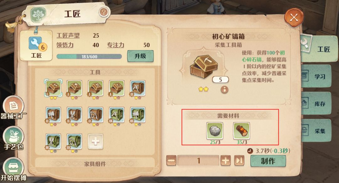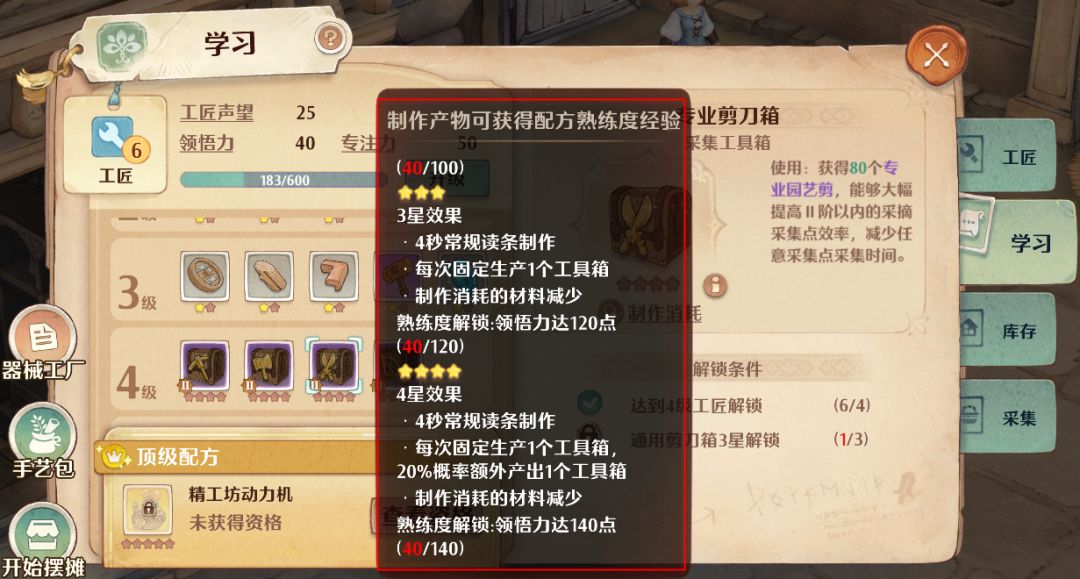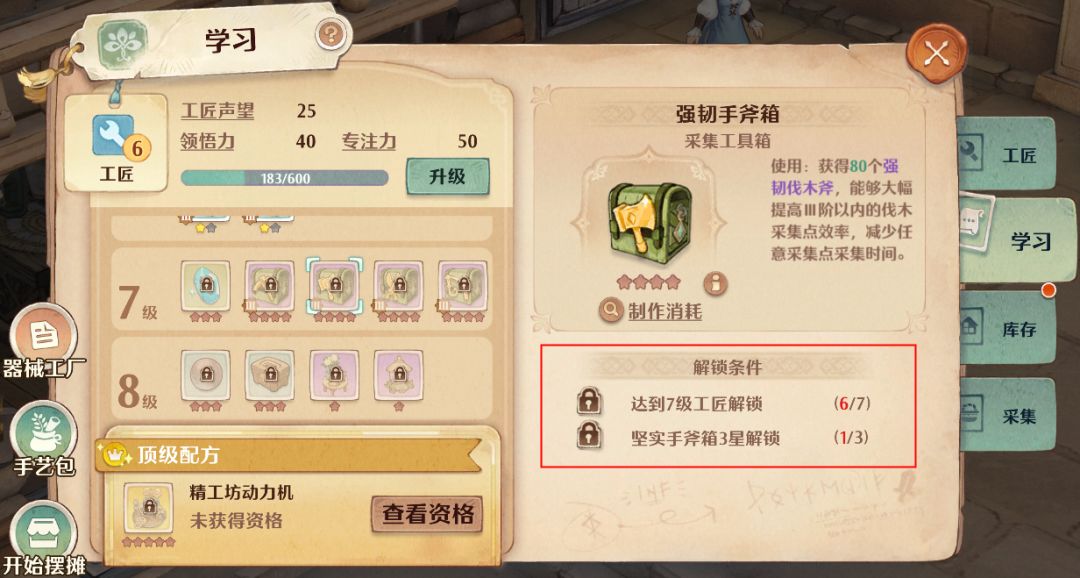 工匠想要解锁新的配方,需要多制作工具和材料提升图纸熟练度星级和工匠等级。