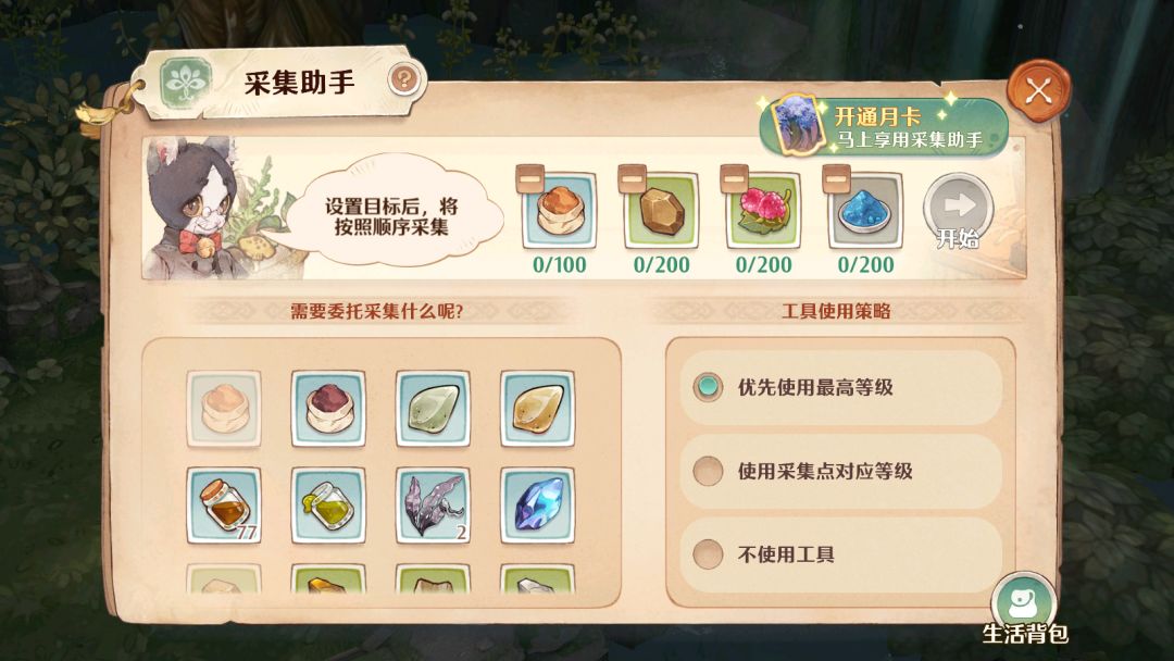 ④购买月卡后会解锁采集助手功能(最多可一次性安排4种材料的自动采集计划!),勇者可以在闲暇时,安排好自动采集计划,直接解放双手!(适度消费,可别贪多哦~)
