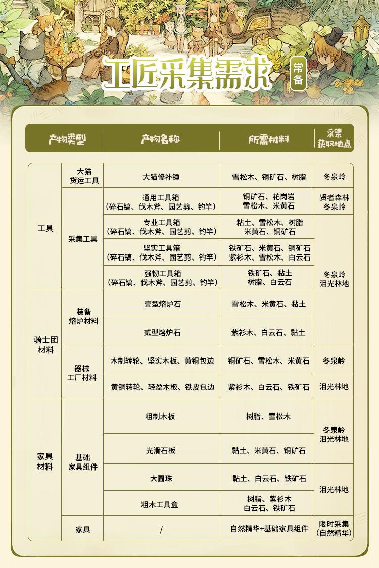 在前期很多配方未解锁的时候,可以先采集积攒材料,等到配方解锁后就可以快速制作升级啦!其中部分素材使用频率较高,推荐勇者先行囤积,例如自然精华、黏土、树脂、各类矿石/木头等。