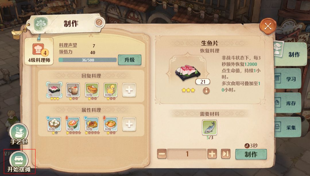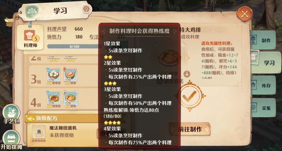 ②重复制作菜品还有概率提升菜品熟练度,制作速度、双倍产出概率、产物属性加成会随着菜品星级提升而提升;
