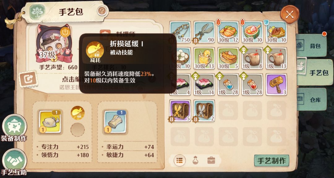高级的手艺装备不仅可以提高手艺相关的属性:领悟力(提升配方熟练度星级上限、解锁高级配方效果、解锁大餐的必要条件)、专注力(缩短制作耗时)、幸运力(提高采集幸运产出概率)、敏捷力(提高采集速度);其中料理师的终极产物大餐需要领悟力达到一定水平后才能解锁!