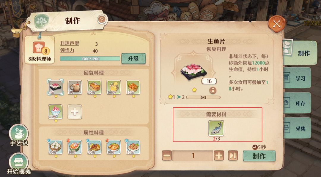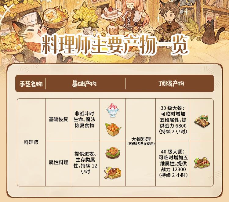 【省流摘要】:料理师可以生产具有脱战回复、短期内增加战力效果的料理,可以通过提前采集“囤货”、打造/强化手艺装备提高生产效率、高效升级,解锁终极目标——生产可以短期提升大量战力的终极大餐!