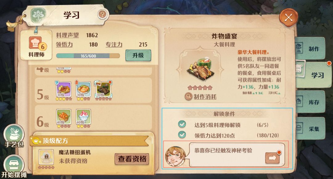 料理师想要解锁新的菜品,需要提高自己的手艺等级和领悟力,大餐需要达到对应的手艺等级和领悟力要求后,完成概率触发的奇遇任务即可解锁大餐。