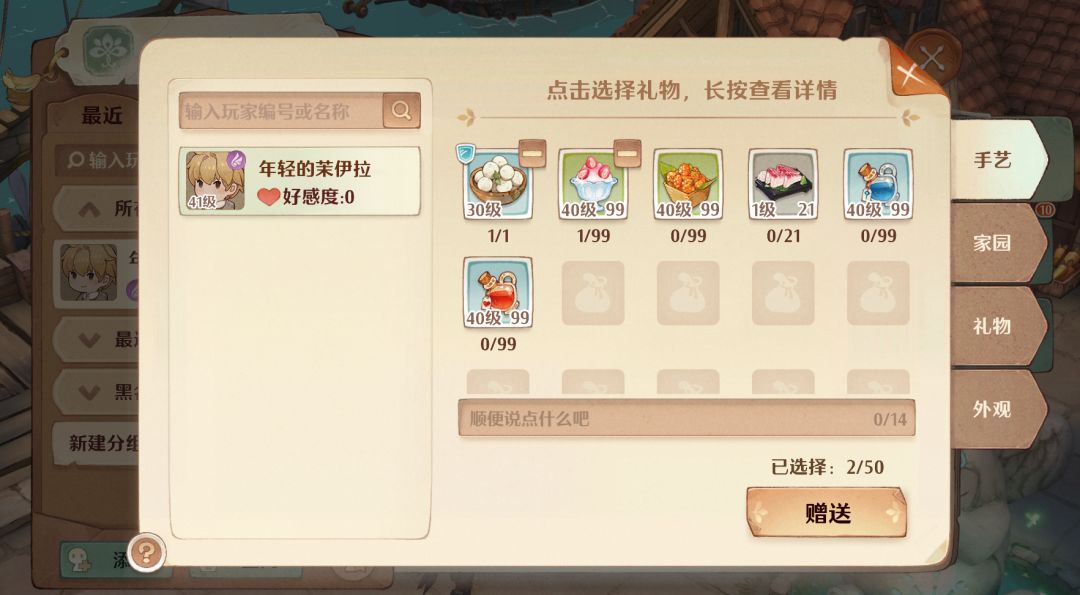 如果觉得以上方式都不够稳妥,就找“手艺搭子”吧!通过【社交-聊天】可以给其他人赠送礼物,可选择的礼物有各个手艺的制作产物、家园产物等(每日赠送无数量限制)。