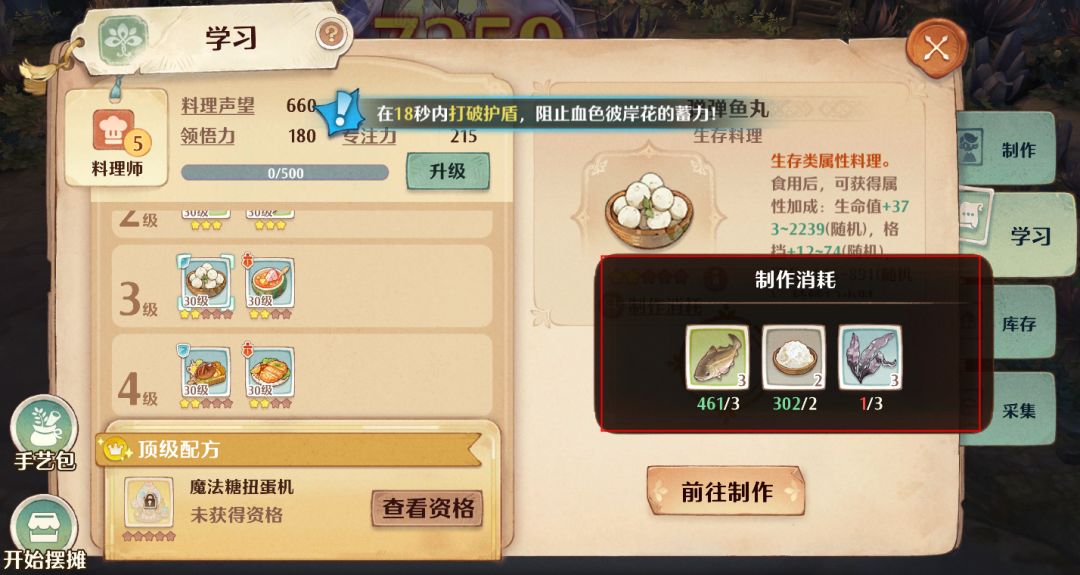 PS:即使配方没解锁也可以在【学习】界面点击【制作消耗】查看对应菜品制作所需的材料,并前置安排自己的采集(就在如图示位置)!