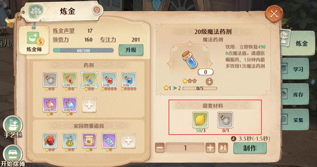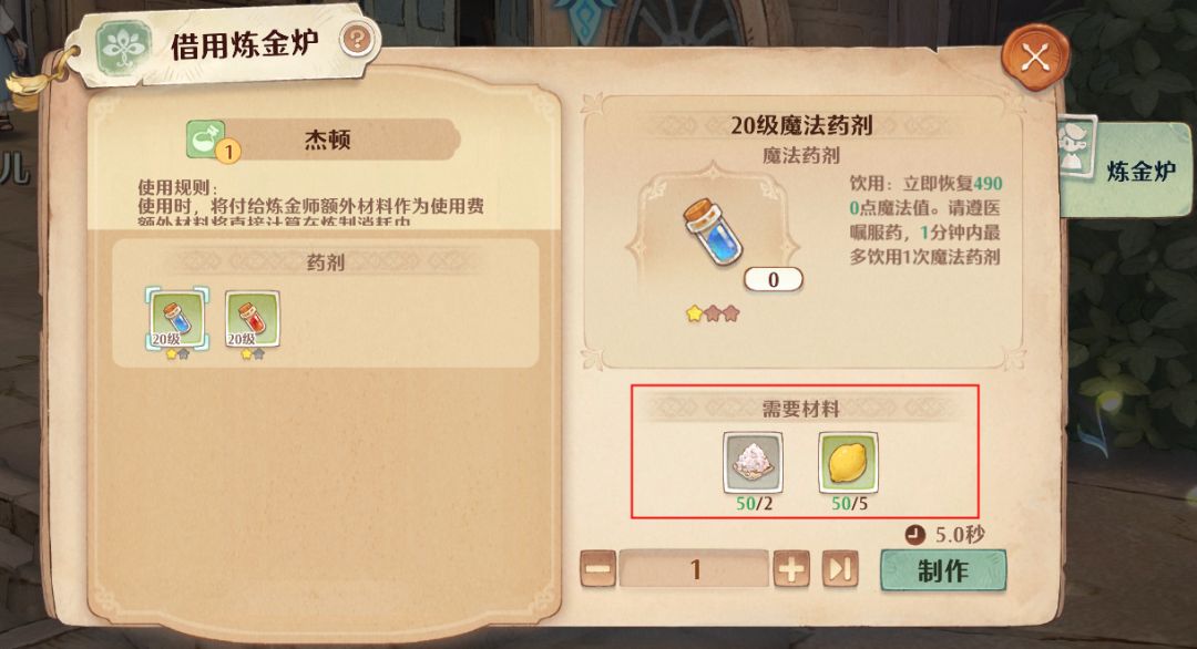前期等级较低时,可以在空闲时候先攒着材料,等到配方解锁后就可以快速炼金“直升”满星啦!其中部分素材需求量较高,推荐勇者先行囤积,例如自然精华、硅砂、甜石榴、红浆果、罗勒、柠檬、棕色汁液等。