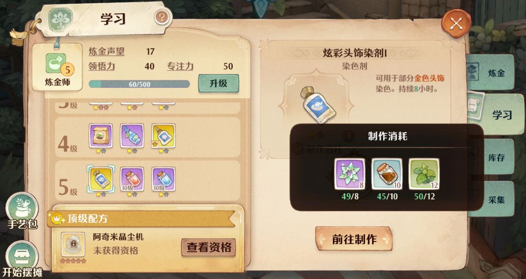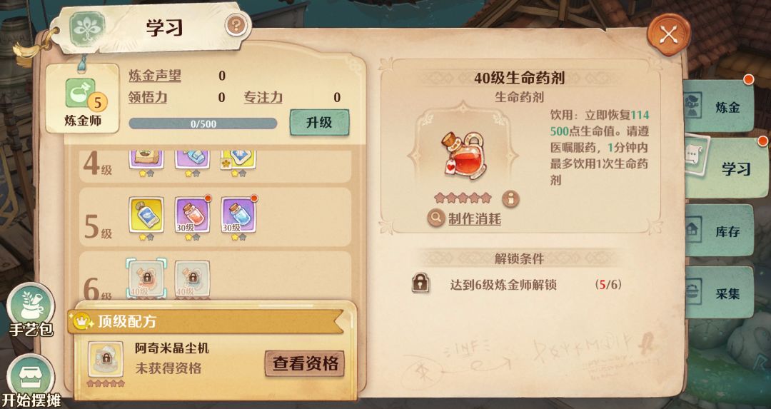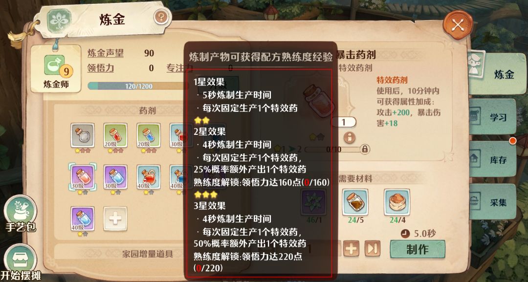 大多数炼金配方的解锁条件都对应着炼金师的等级,手艺晋升及配方升星都需要通过反复生产产物实现。