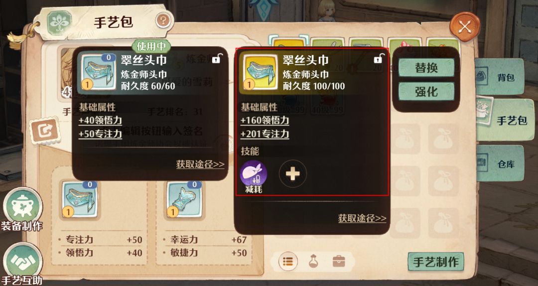 高级的手艺装备不仅可以提高手艺相关的属性:领悟力(提升配方熟练度星级上限、解锁高级配方效果)、专注力(缩短制作耗时)、幸运力(提高采集幸运产出概率)、敏捷力(提高采集速度);其中有些高级的产物需要领悟力达到一定水平后才能解锁!