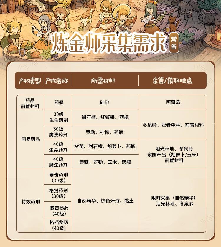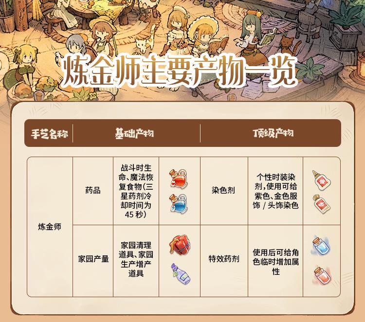【省流摘要】:炼金师可以生产战斗回复药剂、战力提升特效药剂,可以通过提前采集“囤货”、打造/强化手艺装备提高生产效率、高效升级,除了能够解锁效果更强的战力提升药剂外,还可以生产时装染色剂,打造自己的个性化时装!