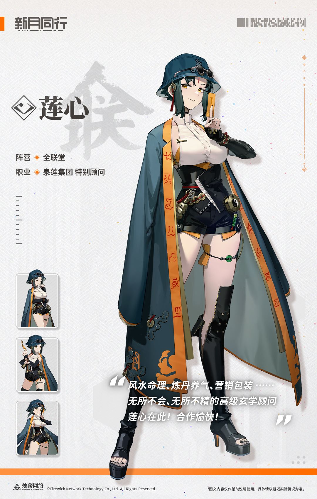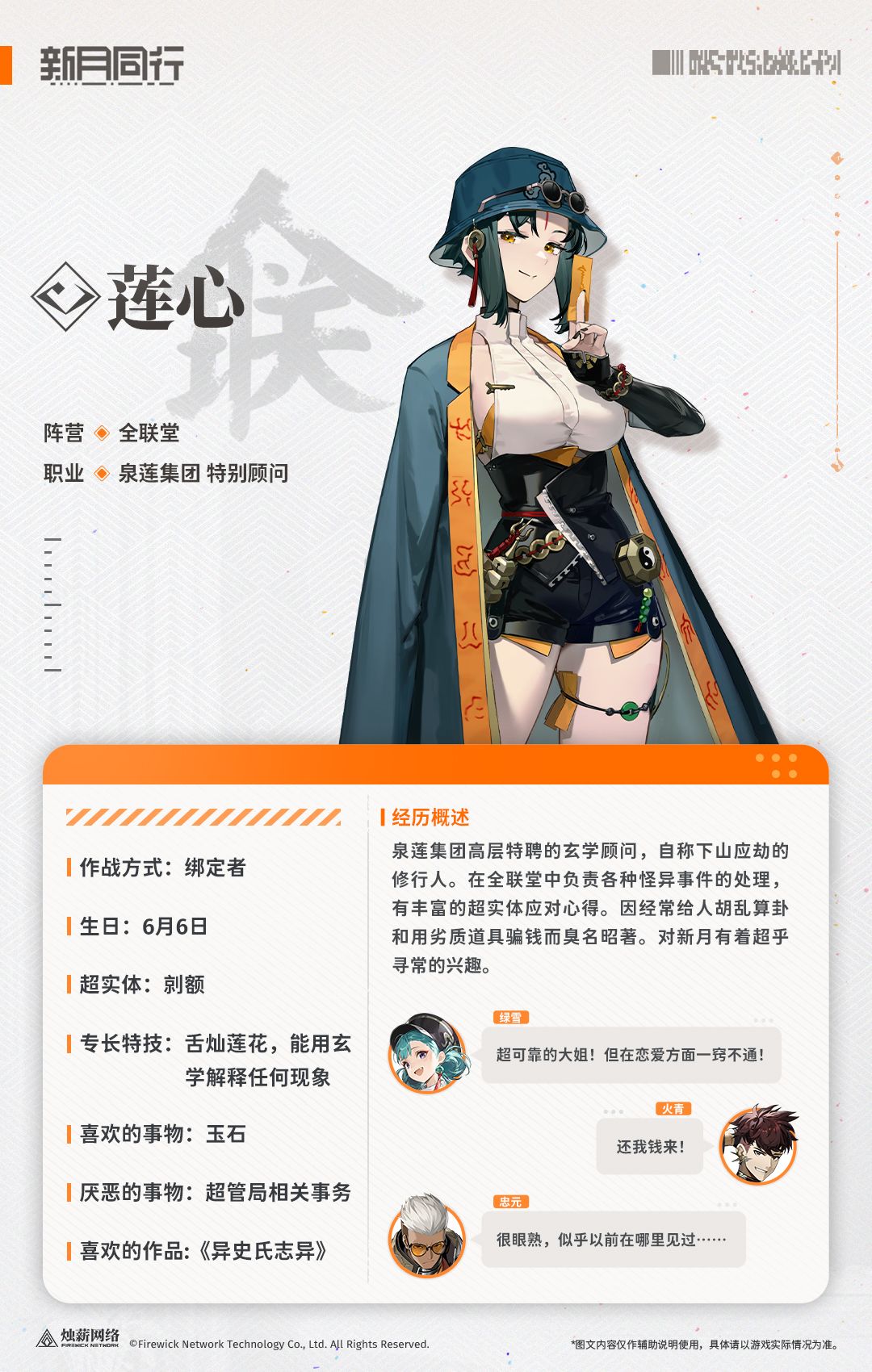 泉莲集团高层特聘的玄学顾问,自称下山应劫的修行人。在全联堂中负责各种怪异事件的处理,有丰富的超实体应对心得。因经常给人胡乱算卦和用劣质道具骗钱而臭名昭著。对新月有着超乎寻常的兴趣。