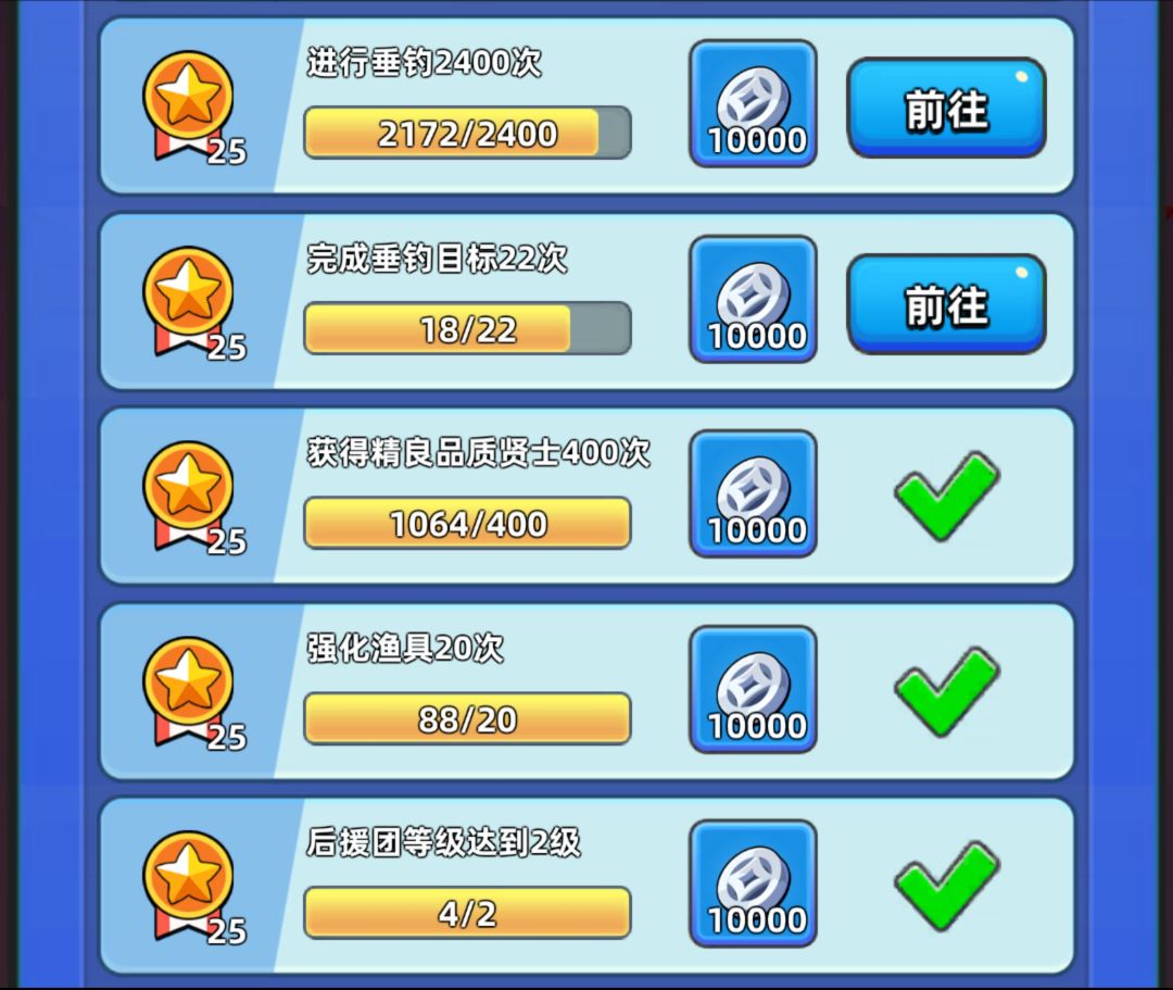 钓鱼的要求的话,特别坑的一点,我是这周第二天才开的钓鱼(主线进度没问题,纯属建号时间的问题),所以第一个任务没拿满。钓鱼每天凌晨更新180体力,一整天恢复180体力,所以在不考虑巧手的情况下(巧手有概率钓鱼不消耗体力),一天可以钓360次,按七天算是2520次,第一个任务是绰绰有余的,但是我少了一天所以就少了25活跃度。对于垂钓目标,每天不氪金的情况下可以完成3次。