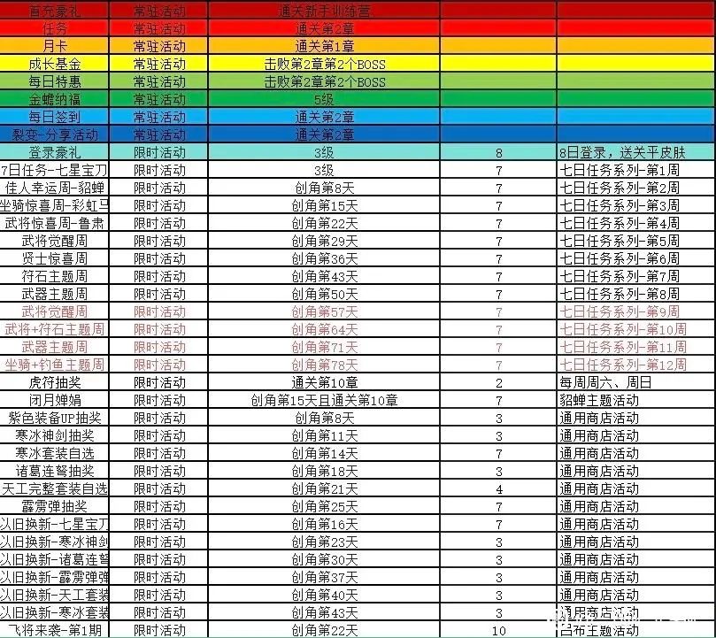 下图是创新号开始每周活动的时间表,我这周创了个新号,我将以每周活动第七天的最终要求给大家建议一些保留的资源。