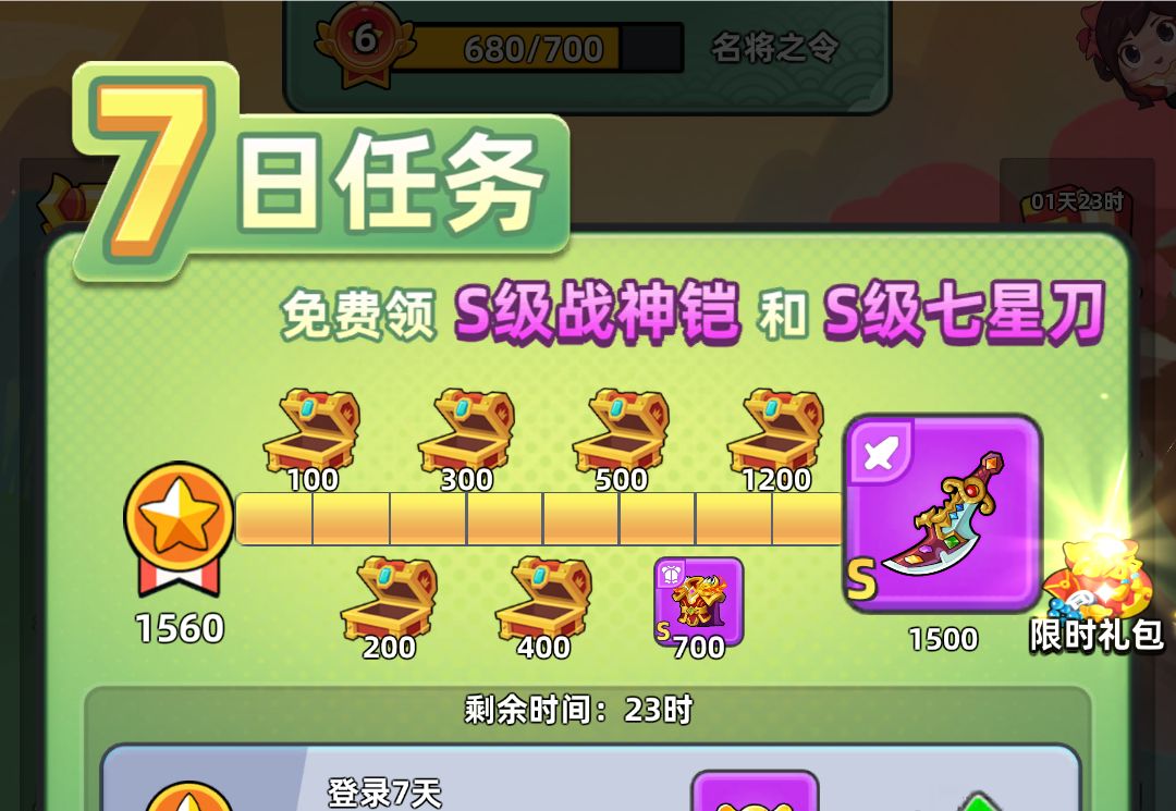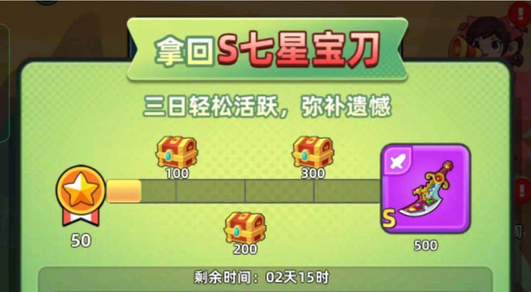 最后没达到七星宝刀的活跃度,还可以花100元宝加三天,都是很简单的任务,所以大家没达到没必要强求。